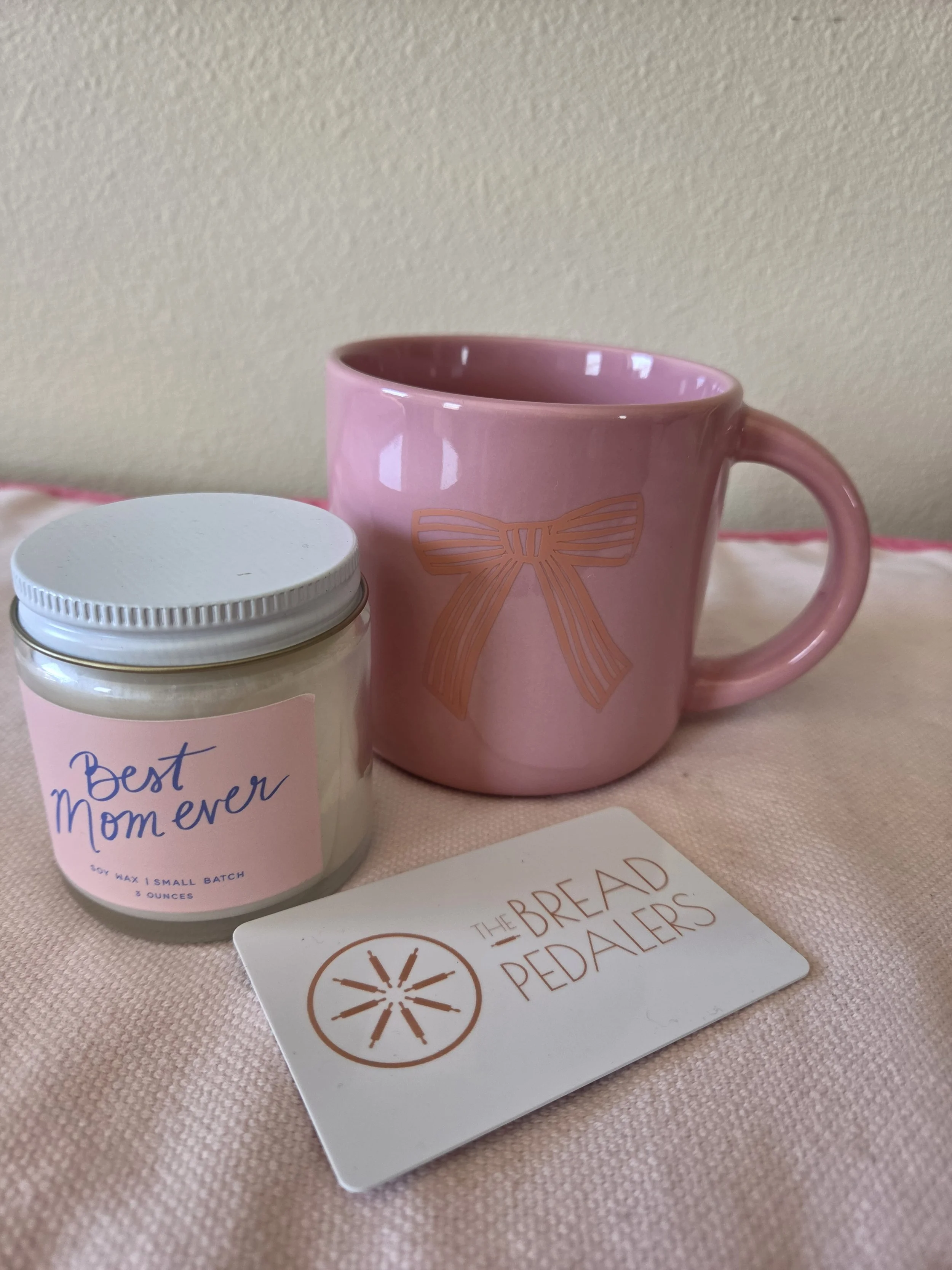 Includes one $20 gift card for The Bread Pedalers, 1 pink bow mug, & 1 3oz candle with “best mom ever” written on front <3